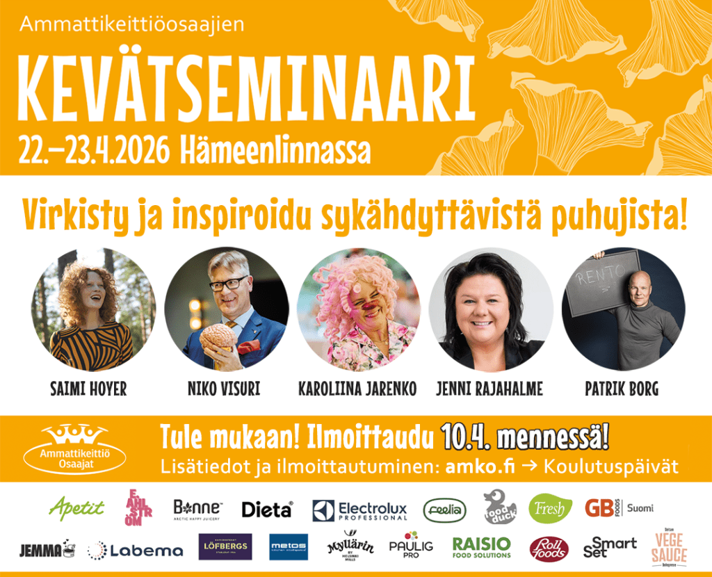 Ammattikeittiöosaajien kevätseminaari Hämeenlinnassa 22.–23.4.2026 tarjoaa ruokapalvelualan ammattilaisille foorumin uusien ideoiden ja käytännön ratkaisujen jakamiseen.