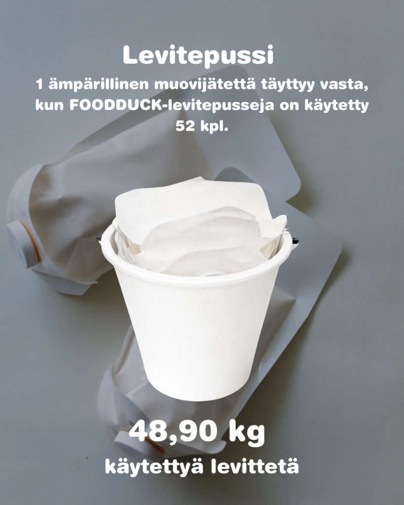 FOODDUCK®-leviteannostelijassa käytettävä pussipakkaus on täysin alumiiniton, mikä tekee sen lajittelusta yksinkertaista ja vaivatonta. Kun kierrätys on helppoa, se toteutuu myös arjessa. Toimiva pakkausratkaisu tukee ruokapalveluiden vastuullisuustavoitteita ja auttaa vähentämään levitteiden tarjoilusta syntyvää pakkausjätettä. Samalla se tekee kestävien valintojen toteuttamisesta helpompaa niin keittiöille kuin organisaatioille.